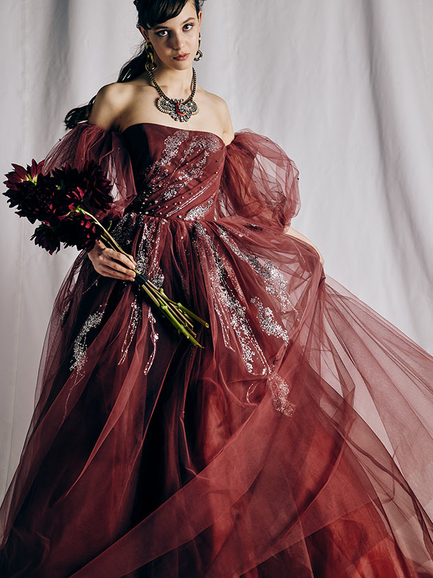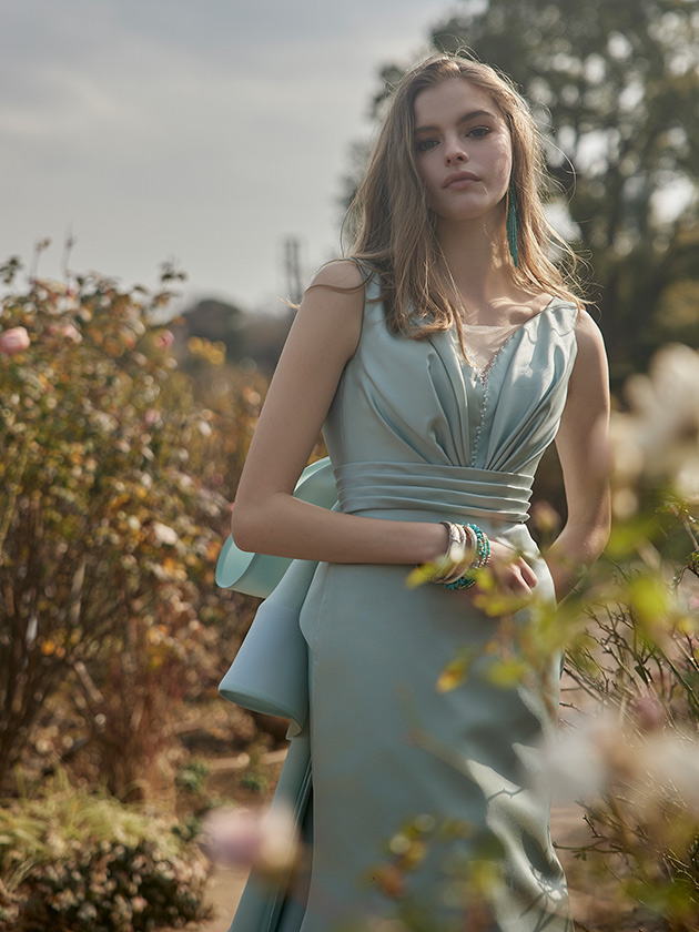 デザイナー樫山智美は、モダンエレガンスを追求し、2WAYの着回しや小物スタイリング提案で、ブライダルファッション業界を牽引。「女性が最も美しく見えるシルエット」と「キャッチーな世界観」にこだわり、多くのおしゃれ花嫁から支持されているブランド。