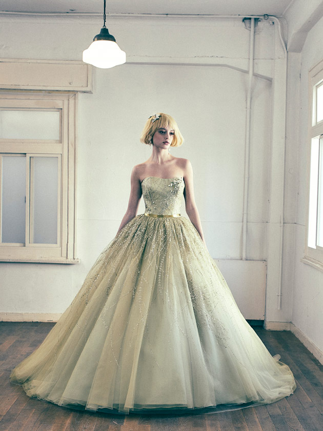 アンテプリマで特に人気のグリーンは、オリーブグリーンにベージュがかったアイボリーを重ね、控えめでヘルシーな癒しカラーに仕上げました。流れのあるグリッターに別の柄をレイアウトすることで、単調さを避け光にメリハリを。軽やかでパフ気味に仕上げたロングスリーブが、小顔効果と現代的なシルエットを演出します。