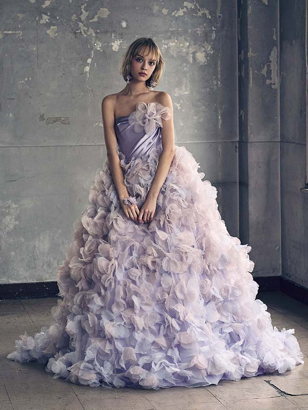 ラベンダーカラーのオリジナルフラワーオーガンが華やかさと落ち着きのバランスを絶妙に表現。瞬時に注目を集める美しさです。ウエストのグログランリボンは、ドレスカラーと濃いめのバイカラー、2パターンをセット。自由にアレンジしていただけます。